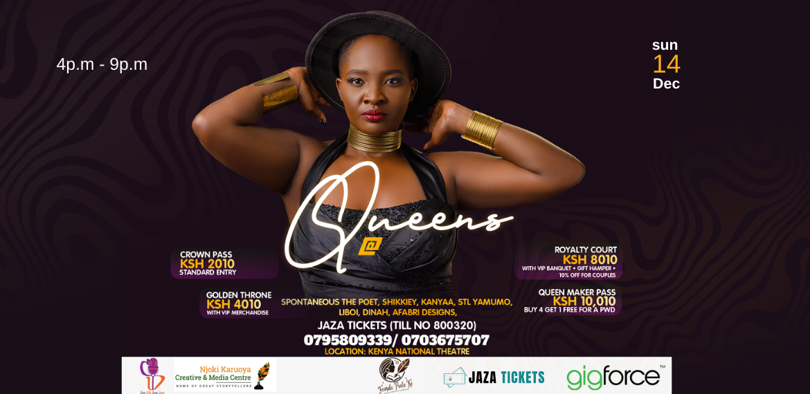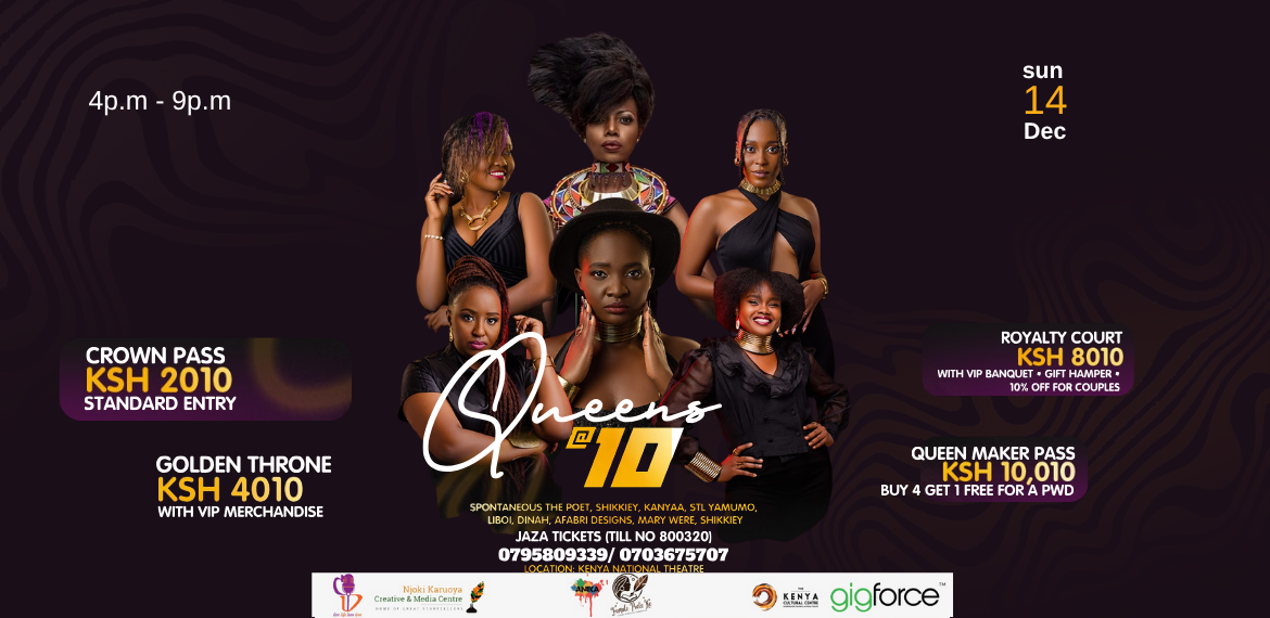 Join us on 14th December at the Kenya National Theatre as Queens@10 celebrates a decade of creativity, passion, and artistic excellence! From 4 PM to 9 PM, experience powerful performances by Spontaneous the Poet, Shikkiey, Kanyaa, STL Yamumo, Liboi, Dinah, and Afabri Designs in a night filled with music, poetry, and unforgettable moments.